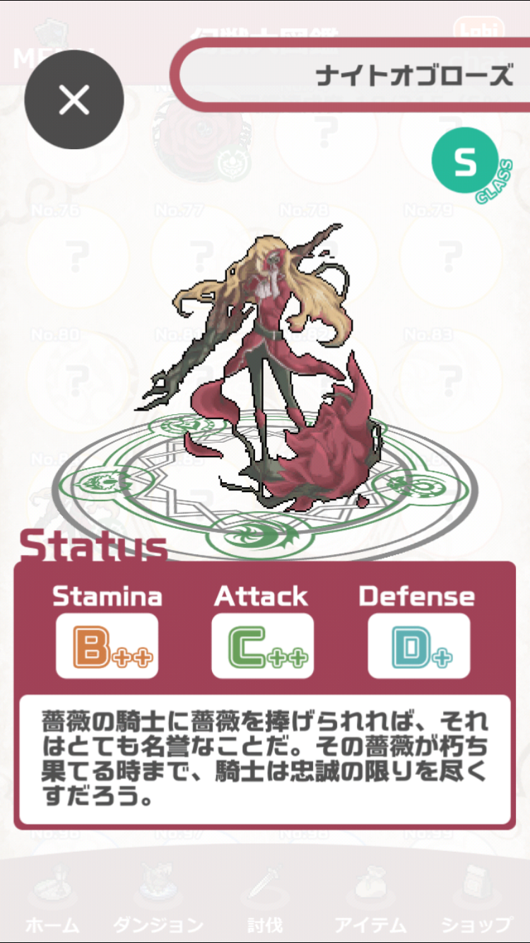 ただ、ユーザー自身のグレードをあげれば討伐で強い敵を倒せたりトレードショップで強い武器を作れます。グレード7にあげるためには幻獣レベルがS以上でないといけないため、私も3転めのここらで一度Sクラスにしておいた方がいいと思い、とりあえず変化のコストがクソ低いナイトオブローズに変化させることにしました。